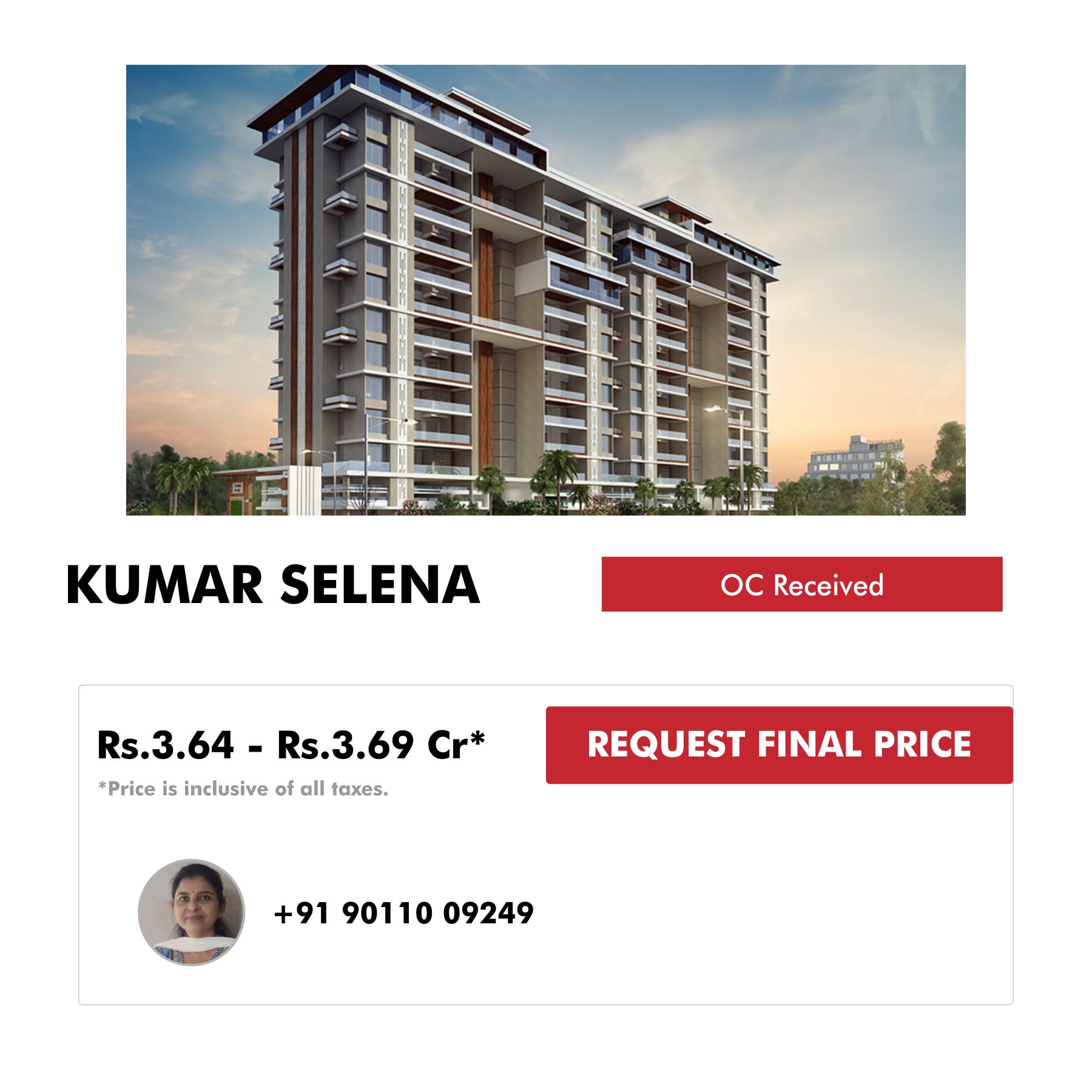 Recognising the allure of this evolving, culturally rich community, KUMAR SELENA brings to you an upscale lifestyle. A distinctive project of two exclusive towers offering 4.5 BHK luxury flats in Baner-Pashan Link Road Pune with every home, having its own private elevator access, you are assured an intimate way of living. An ambience crafted tastefully at a prime yet private location on Baner-Pashan link road offering you Privacy and Luxury.